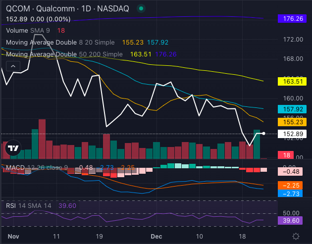 Trading at $152.89, QCOM stock lags below its eight-day, 20-day, 50-day, and 200-day simple moving averages—all flashing bearish signals.