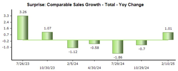 Still, other regions have helped ease the U.S. drag, with global comparable sales overall increasing 0.4% year-over-year. As shown below, the results helped snap a streak of negative surprises on the metric, finally exceeding our consensus estimate.