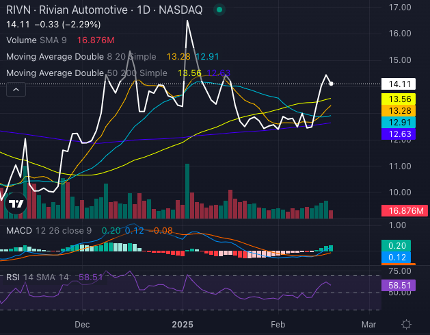 Momentum indicators also support the bullish outlook. The Moving Average Convergence Divergence (MACD) indicator stands at 0.12, signaling positive momentum. Meanwhile, Rivian stock’s Relative Strength Index (RSI) is at 58.51, suggesting the stock is nearing overbought levels but still has room for further gains.
