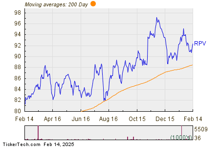 Looking at the chart above, RPV’s low point in its 52 week range is $81.26 per share, with $97.73 as the 52 week high point — that compares with a last trade of $92.42. Comparing the most recent share price to the 200 day moving average can also be a useful technical analysis technique — learn more about the 200 day moving average ».