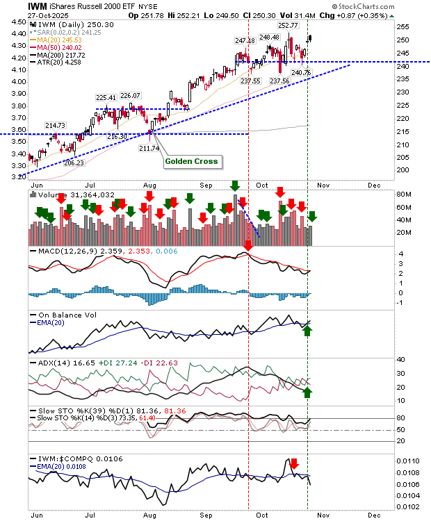 Markets remain bullish, but there are still warning signs that things are still a little hot. In the case of the (), the index closed with a ’black’ candlestick that failed to challenge the $252.77 high (that itself was a spike high).