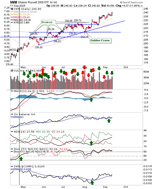 The () maintained its bullish signal in On-Balance-Volume as the pending reversal in relative performance against the was stalled. Technicals remain net bullish with only On-Balance-Volume the weakest.