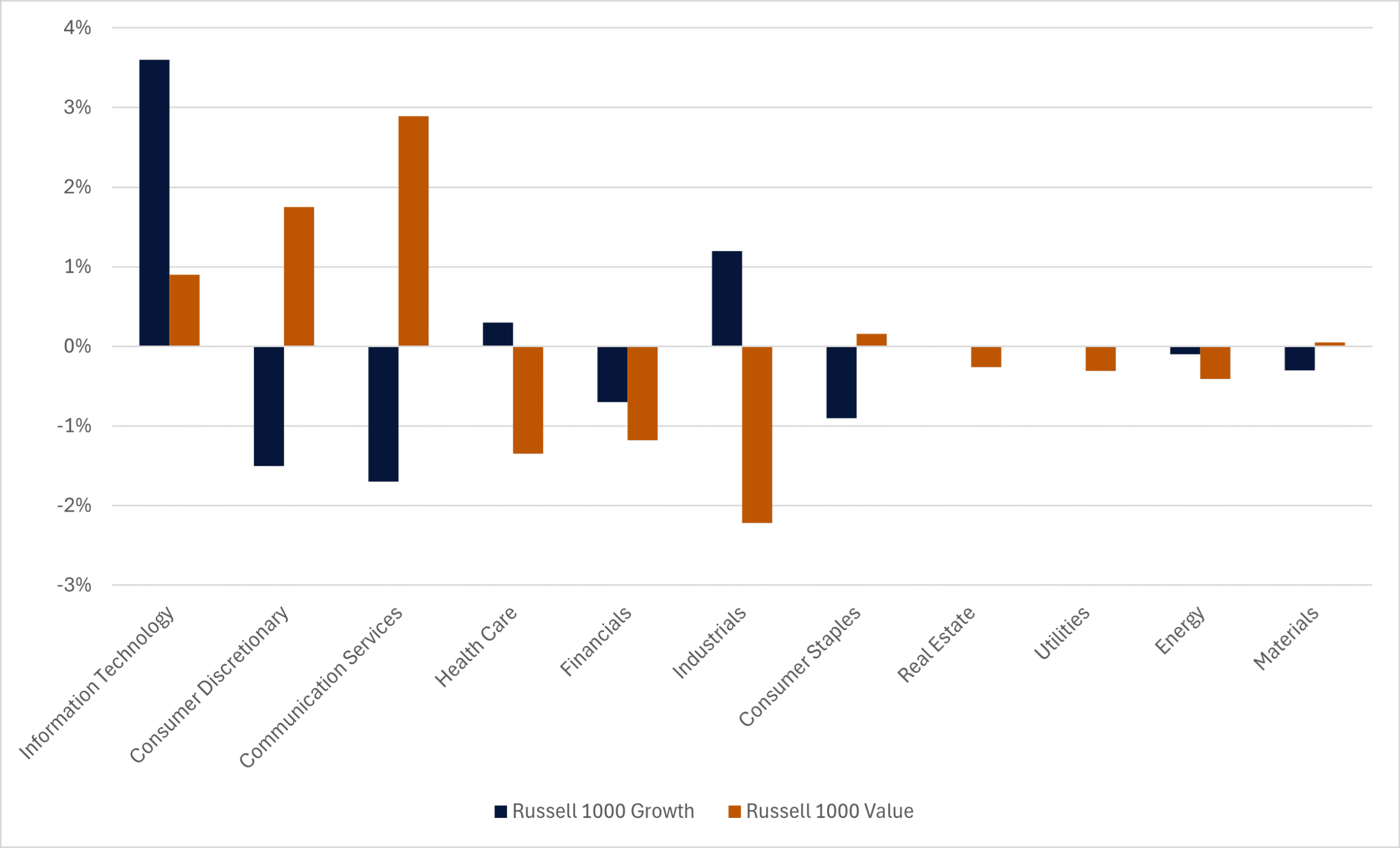 From the 2024 reconstitution’s preliminary rebalancing window (April 30, 2024) to the 2025 reconstitution’s preliminary rebalancing window (April 30, 2025), growth stocks, as measured by the Russell 1000 Growth (Russell 1000 Growth) Index, rose 14.5%, versus value stocks, as measured by the Russell 1000 Value (Russell 1000 Value) Index, increasing 8.6%. Traditional growth industries such as information technology and consumer discretionary propelled growth stocks higher, lifted by artificial-intelligence (AI) enthusiasm and a resilient consumer. More traditional defensive industries, such as healthcare and consumer staples, lagged the index and broader markets.