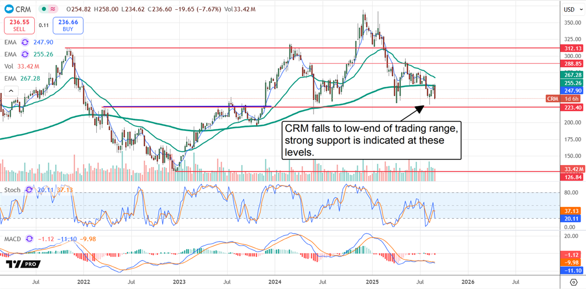 Salesforce analysts are lowering their price targets following the Q2 release and guidance update, but don’t read too much into the movements. The reductions narrow the range around the consensus price target, which forecasts a 35% upside from critical support targets.