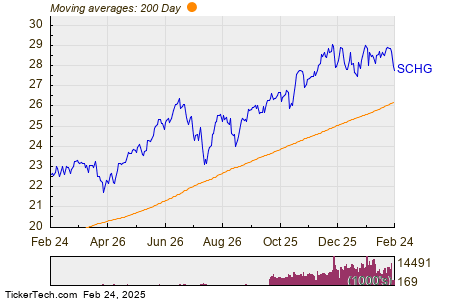 The chart below shows the one year price performance of SCHG, versus its 200 day moving average: