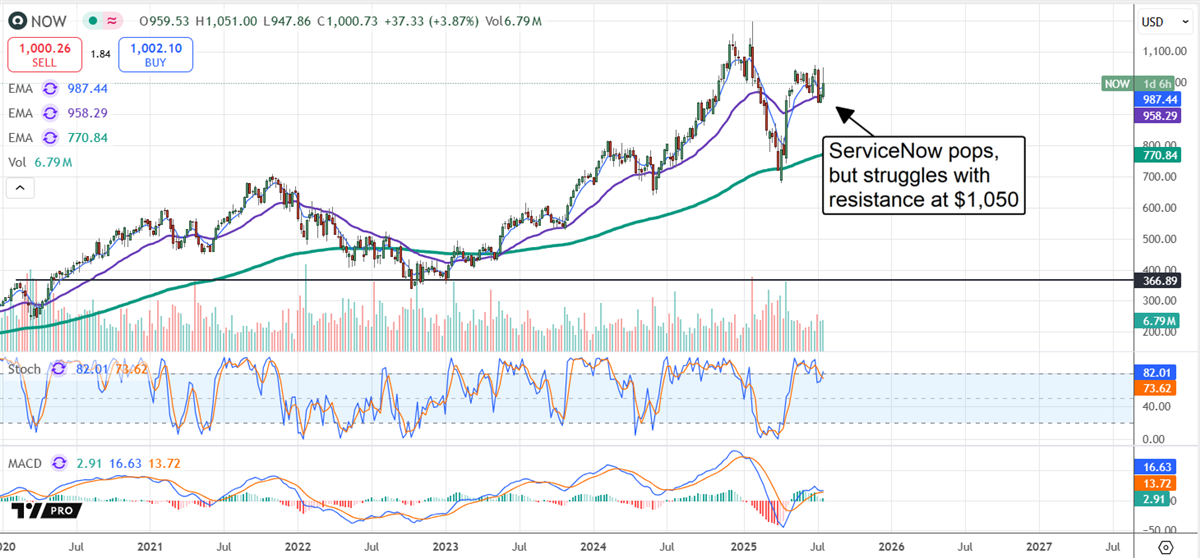 ServiceNow’s stock price surged in the wake of the release but struggled to break through resistance at the top of the near-term range. Resistance at $1,050 may keep this market in check soon, but long-term trends suggest it won’t.