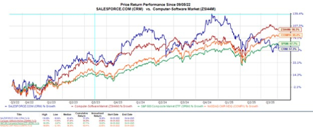To that point, Salesforce stock is now down nearly 30% YTD, but is still sitting on respectable gains of almost +60% in the last three years, although this has trailed the broader indexes and its Zacks Computer-Software Market’s gains of roughly +100%.
