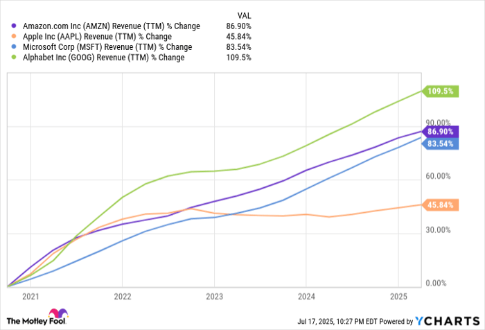 John Mackey, former CEO of Whole Foods Market, an Amazon subsidiary, is a member of The Motley Fool’s board of directors. Suzanne Frey, an executive at Alphabet, is a member of The Motley Fool’s board of directors. Brett Schafer has positions in Alphabet and Amazon. The Motley Fool has positions in and recommends Alphabet, Amazon, Apple, and Microsoft. The Motley Fool recommends the following options: long January 2026 $395 calls on Microsoft and short January 2026 $405 calls on Microsoft. The Motley Fool has a disclosure policy.
