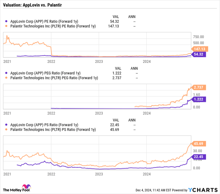 More importantly, from an investing standpoint, while AppLovin’s stock have has actually outperformed Palantir this year, up about 750% as of this writing, it continues to trade at a much more reasonable forward price-to-earnings (P/E) of 54 based on 2025 analyst estimates, and a price/earnings-to-growth (PEG) of 1.2.
