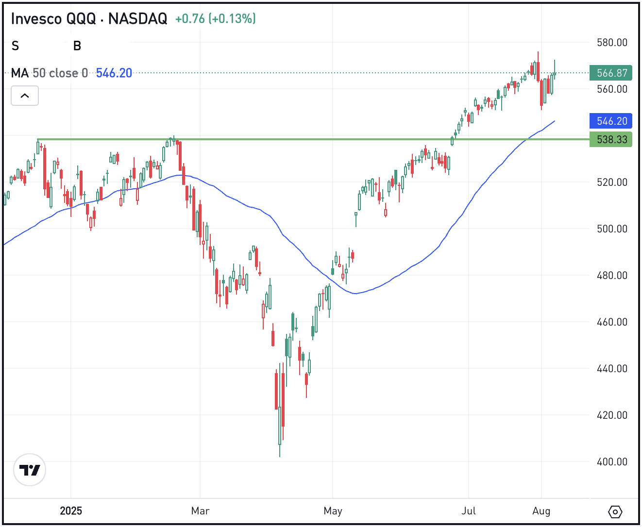 A lot of heavy-hitting tech companies have been in focus lately, including Nvidia (NASDAQ:), Apple (NASDAQ:), and Palantir (NASDAQ:). And despite some of the turbulence lately, the Invesco QQQ Trust (NASDAQ:) remains down just slightly from the record high it set last week. Chart as of the close on 8/7/2025. Source: eToro ProCharts, courtesy of TradingView.