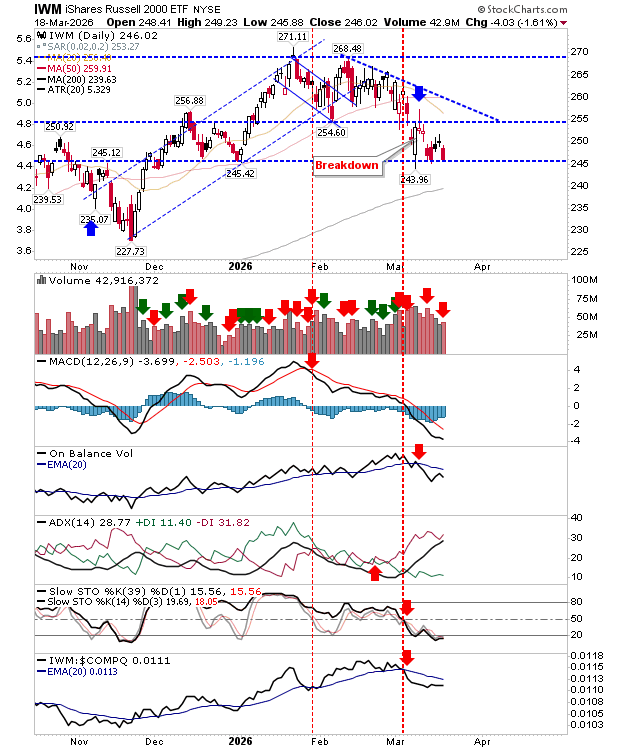 The () experienced a higher-volume distribution day amid net bearish technicals. Yesterday’s loss closed on $245/6 support, but another day’s worth of selling will open up a test of the 200-day MA, and maybe a follow-through move down to $228.
