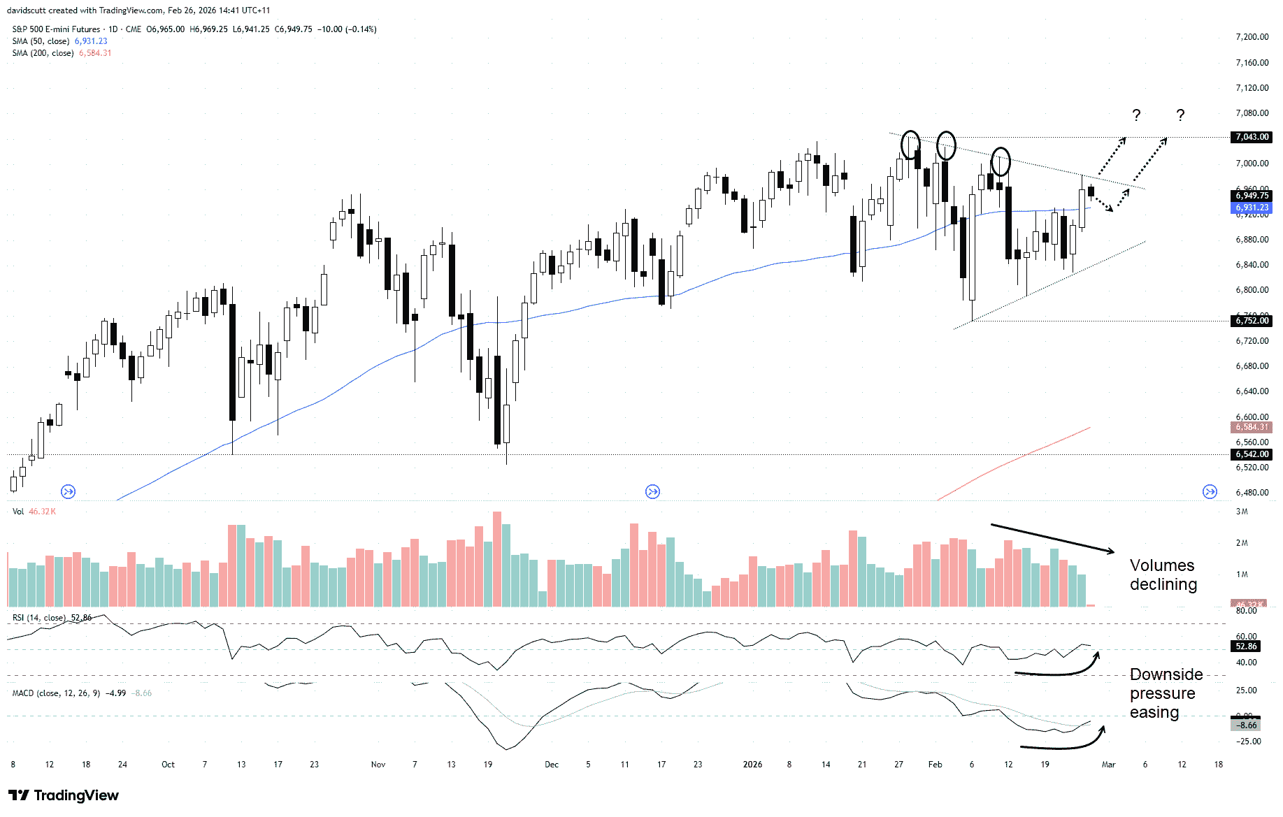 A clean break above downtrend resistance would shift attention back towards the record highs, with price action above 7000 looming as critical. Repeated probes above this region have seen futures close well off session highs, highlighting lingering hesitation. A bullish close above the highs, or preferably a decisive break above them on stronger volumes, would add to confidence that the broader uptrend is resuming. In that scenario, 7043 stands out as a natural target or reassessment zone for longs.