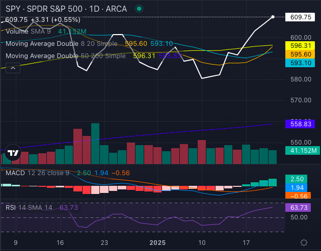 SPY has been climbing higher, benefiting from several bullish technical indicators.