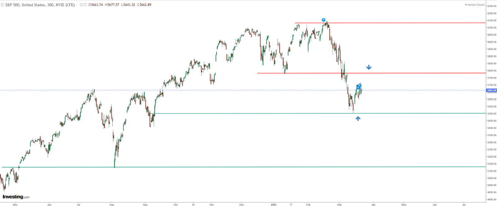 The sharp decline in the S&P 500 halted around the 5500-point support zone, leading to a rebound and a period of consolidation. The index is now trading between the 5500 support level and the 5780 resistance level.