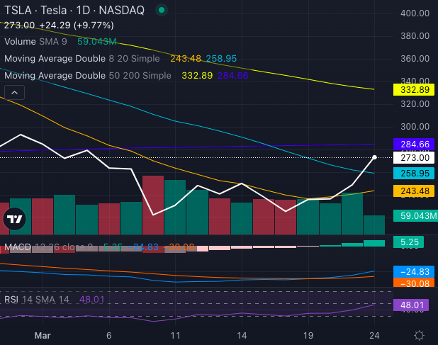 • The eight-day simple moving average (SMA) of $243.48 and 20-day SMA of $258.95, signal some bullish momentum, with the current price at $273.00.