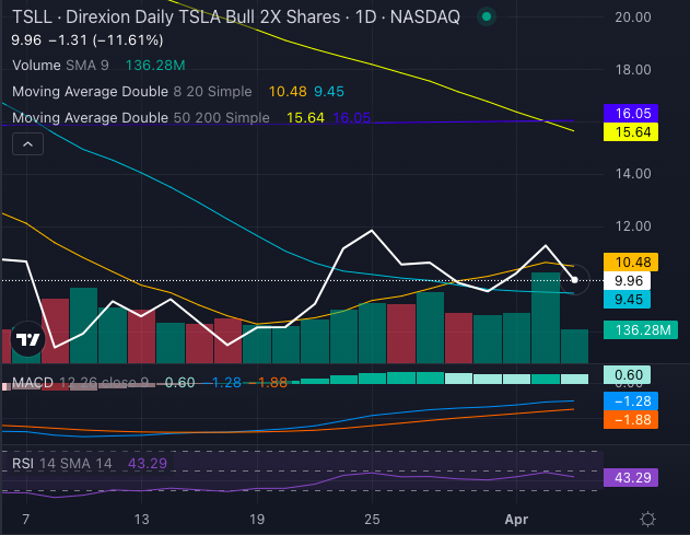 Both the Direxion Daily TSLA Bull 2X Shares TSLL and the GraniteShares 2x Long TSLA Daily ETF TSLR have succumbed to this bearish indicator, raising the question: Are things about to get worse, or is this the perfect contrarian bullish signal?