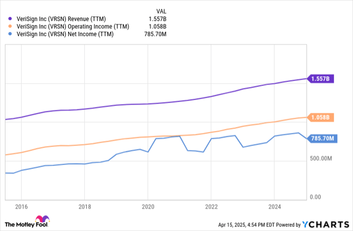 What VeriSign lacks in growth firepower, however, it more than makes up for in consistency. Revenue has grown every single quarter (year over year) for well over a decade now, in fact, while operating income has grown almost as a reliably, and certainly just as quickly. Plenty of companies envy this steady forward progress.