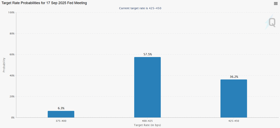 As you can see below, the current probability of at least one quarter-point cut in September clocks in at almost 65%.
