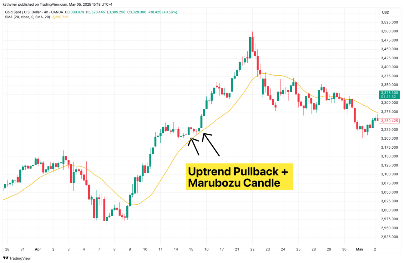 This is a classic—and for good reason. In an uptrend, price moves higher in waves, with temporary dips along the way. Those dips are your golden opportunity. Instead of chasing a price that’s already run up, wait for it to pull back to a key level (like a moving average or trendline). When buyers step back in, you ride the next leg higher—with reduced risk and much better timing. Combine this with bullish candlestick patterns or momentum confirmation on lower timeframes, and you’ve got one of the highest-probability entries out there. A perfect example is pulling back to its 20-period SMA and forming a strong Marubozu continuation candle—textbook price action for the next leg higher.