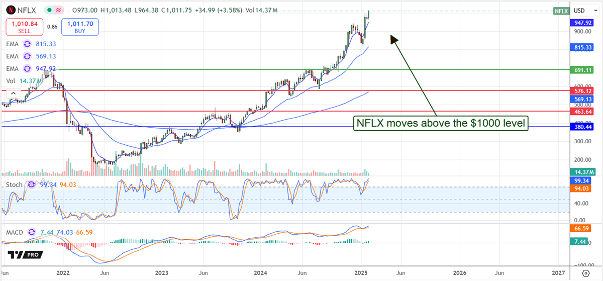 Regarding the stock price, it crossed above the $1000 level following the Q4 2024 earnings release and is on track to hit $1100 or higher based on technical readings. That aligns with the analysts’ sentiment trends, which indicate that a move into the $1100 to $1200 region is possible this year. At that level, Netflix could split by as much as 10-for-1.