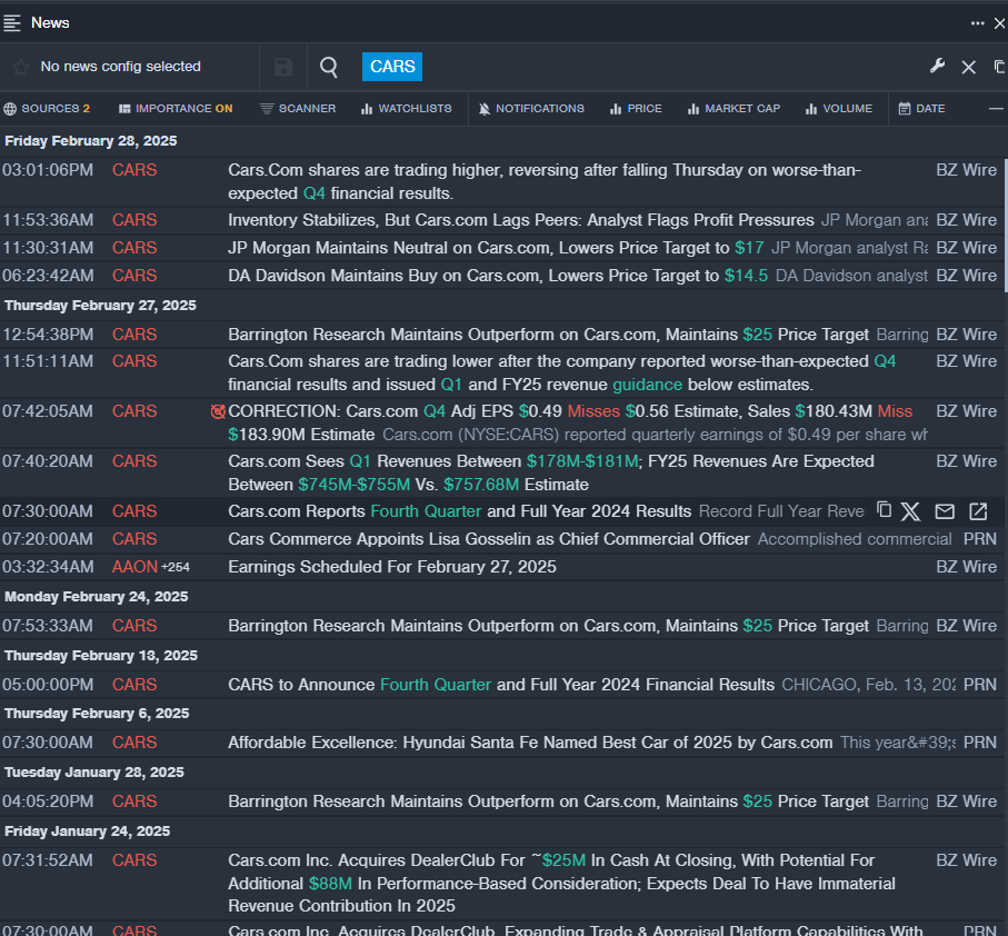 • On Feb. 27, Cars.Com reported worse-than-expected fourth-quarter financial results and issued FY25 revenue guidance below estimates. “Our fourth quarter was highlighted by strong OEM and National revenue, which was up 15% year-over-year, and robust Adjusted EBITDA margin of nearly 31%, capping a year of solid growth and consistent profitability improvement. As the automotive industry looks for efficiency, the benefits of leveraging our platform of connected solutions are leading to measurable benefits and meaningful sales impact for our customers,” said Alex Vetter, Chief Executive Officer of Cars Commerce. The company’s stock fell around 24% over the past month and has a 52-week low of $11.78.