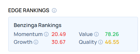 • Edge Stock Ratings: 20.49 Momentum score with Value at 78.26.