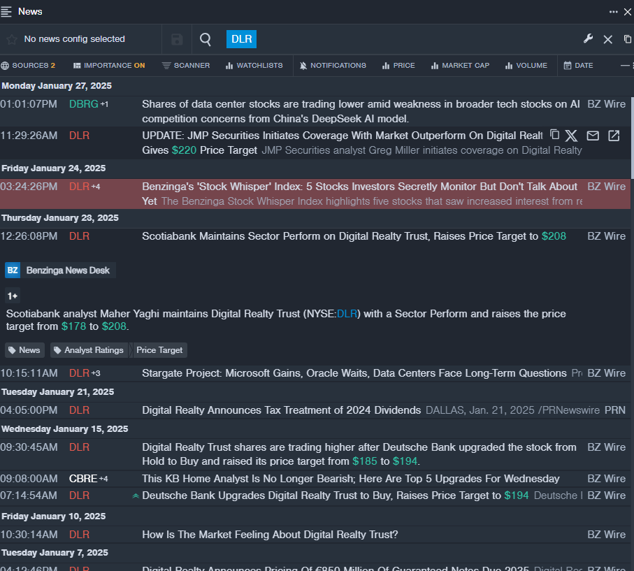 - On Jan. 27, JMP Securities analyst Greg Miller initiated coverage on Digital Realty Trust with a Market Outperform and announced a $220 price target. The company’ stock fell around 9% over the past five days and has a 52-week low of $131.42.