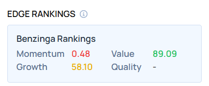 - Edge Stock Ratings: 0.48 Momentum score with Value at 89.09.