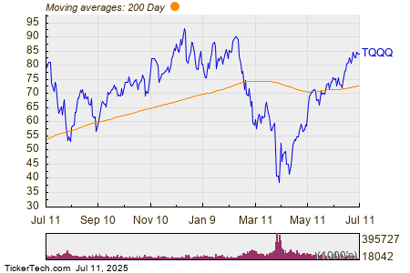 Looking at the chart above, TQQQ’s low point in its 52 week range is $35 per share, with $93.7892 as the 52 week high point — that compares with a last trade of $84.23. Comparing the most recent share price to the 200 day moving average can also be a useful technical analysis technique — learn more about the 200 day moving average ».