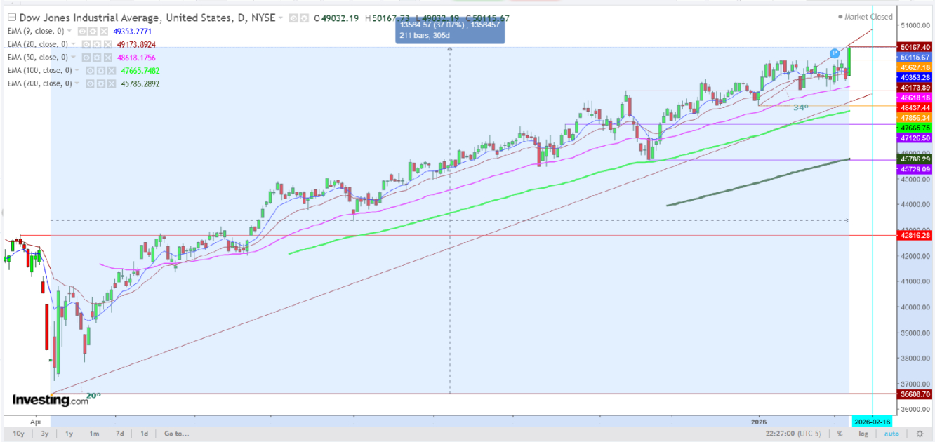 Dow Jones Industrial Average Index Daily ChartThe Dow tested a record high at 50,167.73 before closing the day at 50,115.67, after testing the day’s low at 4,932.19, after trading in a narrow range between 48.880 to 49,627 – a level, where the Dow had been constantly making futile attempts to cross this significant resistance since Jan.7, 2026, finally succeeded on Feb. 6, 2026 with 2.47% gain.