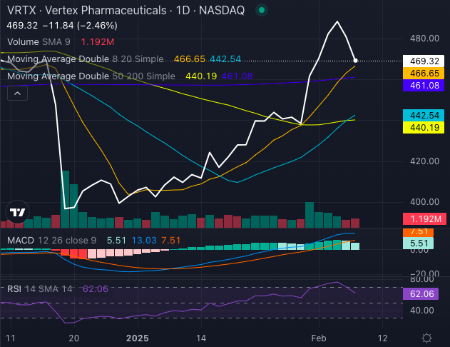 Technicals are giving mixed signals. VRTX stock is trading at $469.32, above its eight-day, 20-day, 50-day and 200-day moving averages, flashing buy signals across the board.