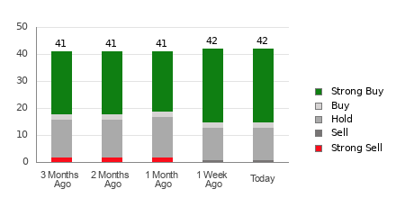 Netflix currently has an average brokerage recommendation (ABR) of 1.68, on a scale of 1 to 5 (Strong Buy to Strong Sell), calculated based on the actual recommendations (Buy, Hold, Sell, etc.) made by 42 brokerage firms. An ABR of 1.68 approximates between Strong Buy and Buy.