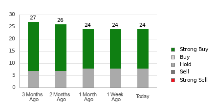 Merck currently has an average brokerage recommendation (ABR) of 1.67, on a scale of 1 to 5 (Strong Buy to Strong Sell), calculated based on the actual recommendations (Buy, Hold, Sell, etc.) made by 24 brokerage firms. An ABR of 1.67 approximates between Strong Buy and Buy.