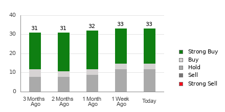 Costco currently has an average brokerage recommendation (ABR) of 1.80, on a scale of 1 to 5 (Strong Buy to Strong Sell), calculated based on the actual recommendations (Buy, Hold, Sell, etc.) made by 33 brokerage firms. An ABR of 1.80 approximates between Strong Buy and Buy.