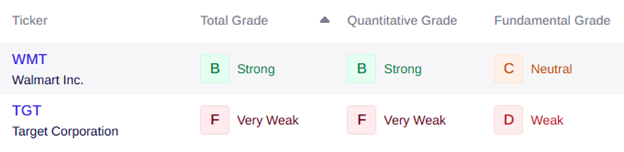 Target, on the other hand, receives poor marks across the board, with a Quantitative Grade of F, a Fundamental Grade of D and a Total Grade of F, making it “Very Weak.”