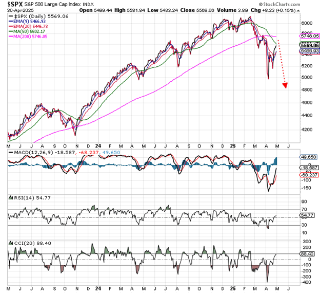 Look at the action in early April and notice how the momentum indicators at the bottom of the chart do NOT show any positive divergence. The MACD, RSI, and CCI indicators made lower lows right along with the S&P.