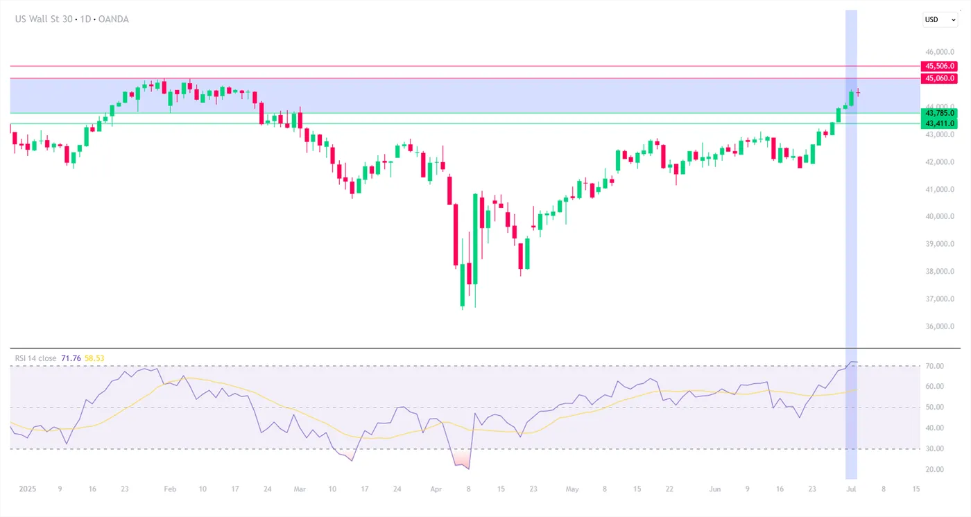 Dow Jones Industrial Average (US30USD), OANDA, TradingView, 02/07/2025